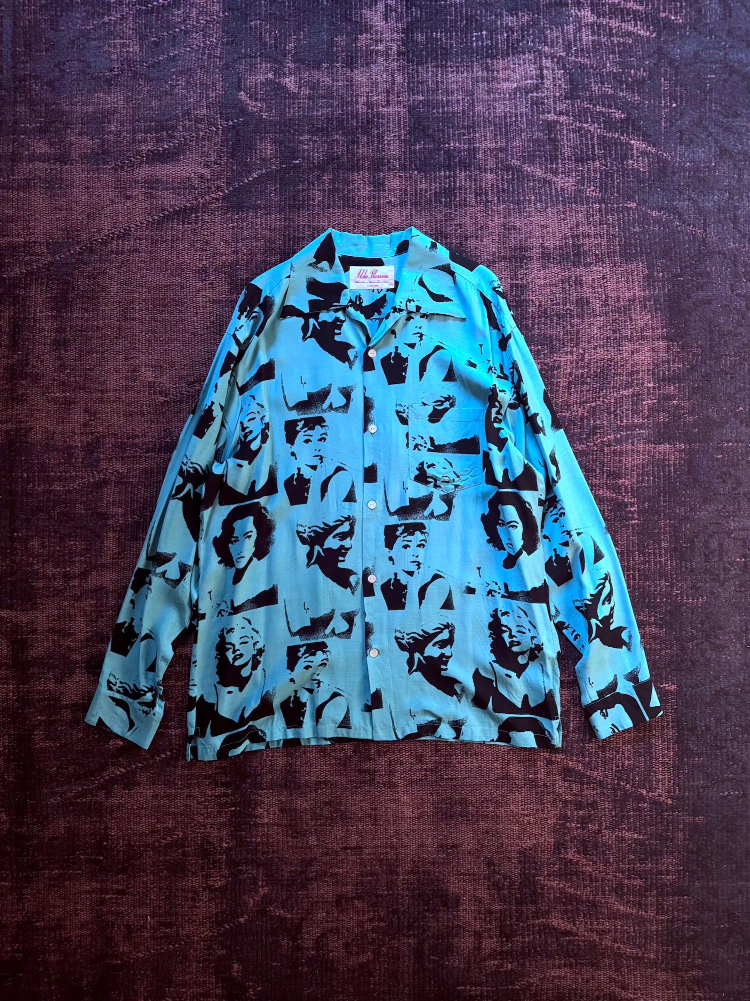 -長袖、レーヨン素材、スクエアカット、オープンカラー仕様。